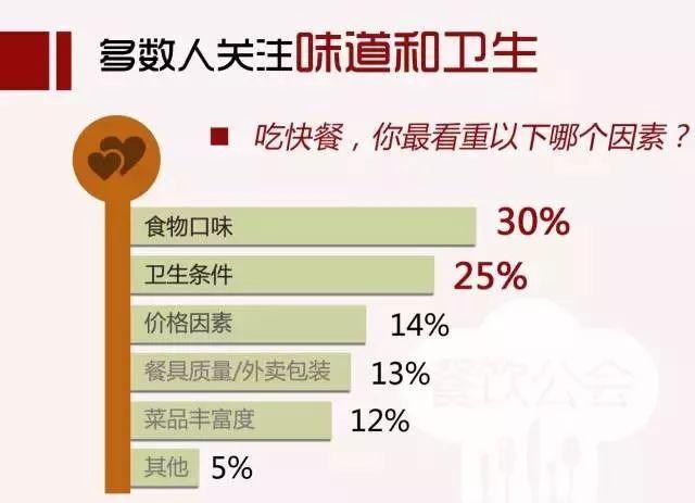 选择快餐时最关注的因素中,30%的人选择了口味,25%的人最注重的是卫生条件,只有14%的人首先关注价格问题,这和关注餐具质量、外卖包装这些视觉化体验的人比例差不多。