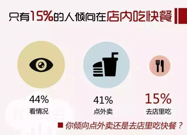 在所有餐饮业态中,快餐一定是被各大外卖平台改造最为彻底的一个。在调查中,只有15%的人明确表示自己会去店里吃一顿快餐。只愿意点外卖的用户占41%,剩下的44%的人会看情况决定是否要去店内吃还是叫外卖。