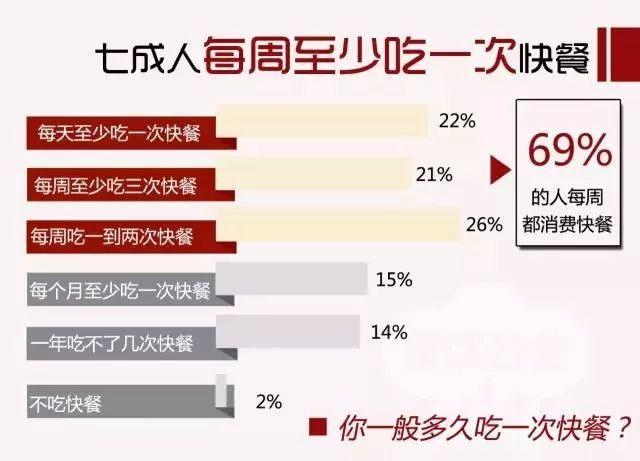 在调查中,有22%的人表示他们每天至少吃一顿快餐,而每周吃三次快餐和每周吃一到两顿快餐的人分别占21%和26%。也就是说,69%的人每周至少会吃一次快餐。