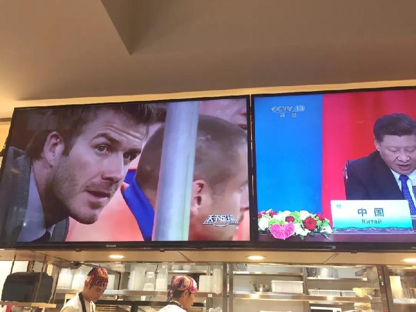 在这个不到 300 平米的空间内,配备了 6 个屏幕,6 月底开业后,直播世界杯比赛成了它们最主要的工作,如果对头上的电视内容不感兴趣,埋头专心玩手机也是可以的,为了防止顾客手机电量不足,西贝在每个位置上配置了电源和 USB 接口。